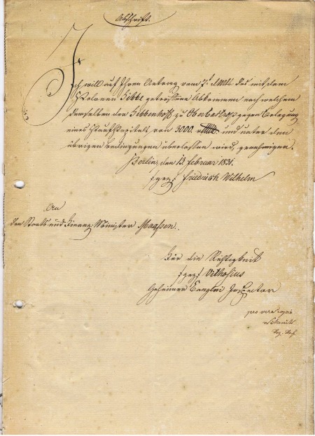 Abschrift vom 13.02.1831: Ich will auf Ihren Antrag vom 7. dMts. das mit dem Kolonen Sibbe getroffene Abkommen nach welchem demselben der Sibbenhoff zu OberCastrop gegen Erlegung eines Kaufkapitals von 3000 Rtlr und unter den übrigen Bedingungen überlassen wird, genehmigen. Berlin, den 13. Februar 1831 gez. Friedrich Wilhelm